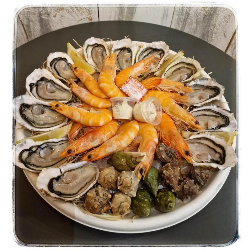 Composition pour 4 pers : 24 huitres moyennes N°3, 24 belles crevettes, 24 escargots, beurre, citron, aïoli.